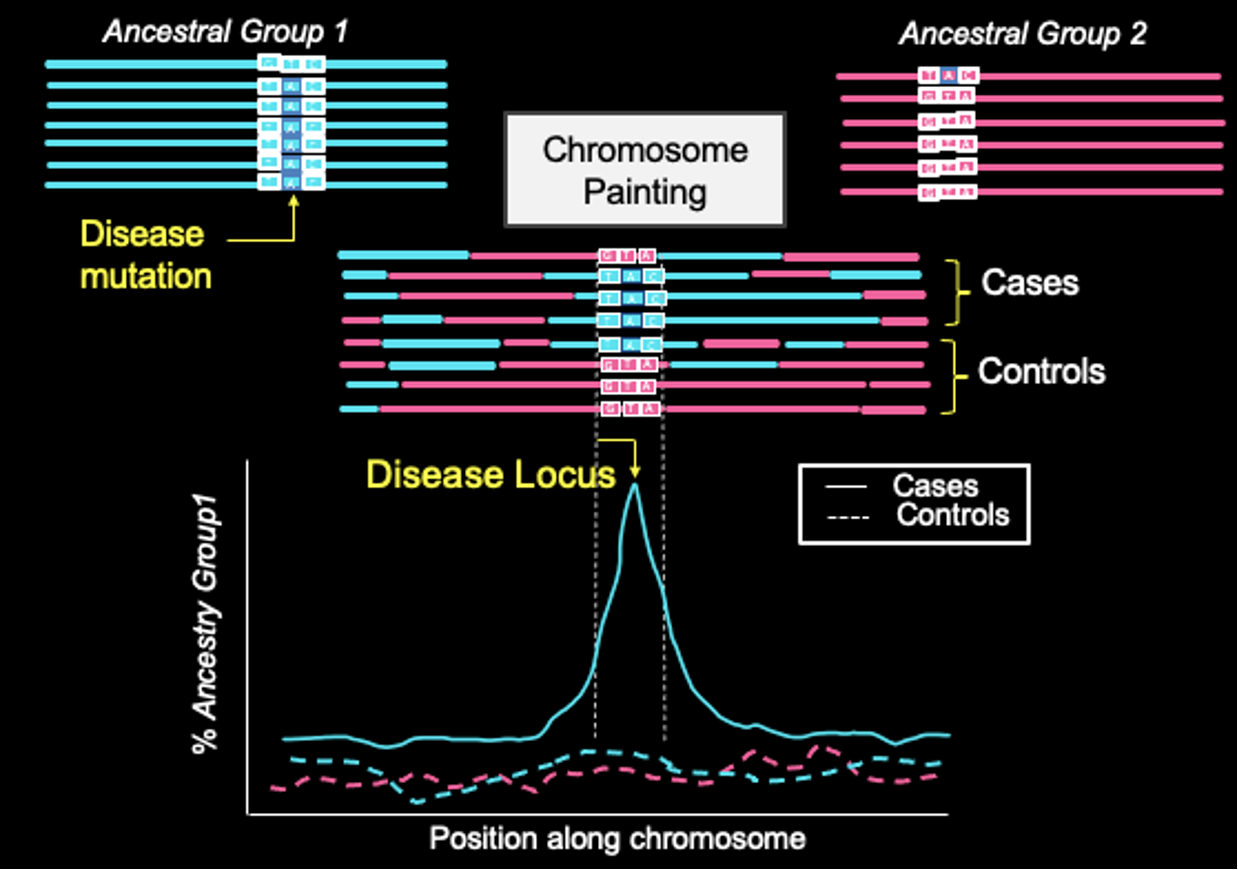 We use insights from human evolutionary history to identify genetic variants that influence adaptation and disease risk. By studying patterns of natural selection, archaic introgression, and population-specific genetic variation, we aim to pinpoint variants that have functional and phenotypic consequences. Our work leverages large-scale genomic datasets to understand how evolutionary forces—such as admixture, founder events and demographic history—shape the distribution of disease-associated alleles across populations. As one example, we are developing methods such as admixture mapping (illustrated in the figure), which uses local ancestry variation to localize disease-associated loci by identifying regions with excess ancestry from higher-risk populations. Together, these approaches provide a powerful framework for interpreting genetic variation in biomedical studies, particularly in underrepresented populations.